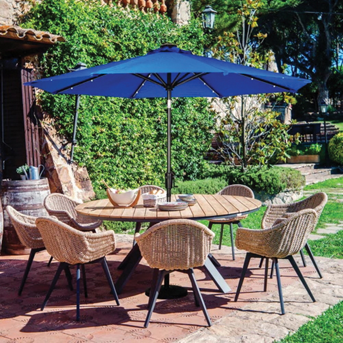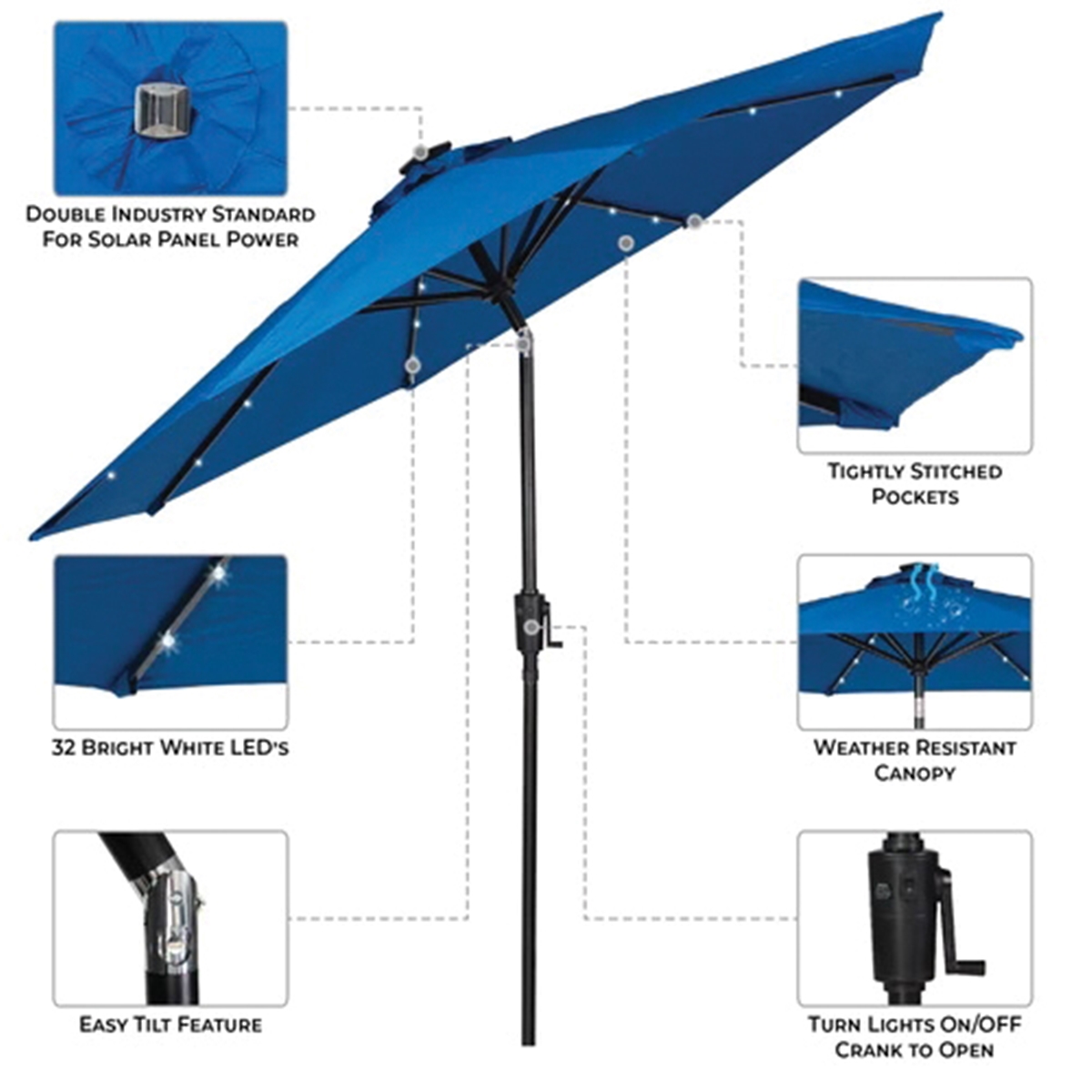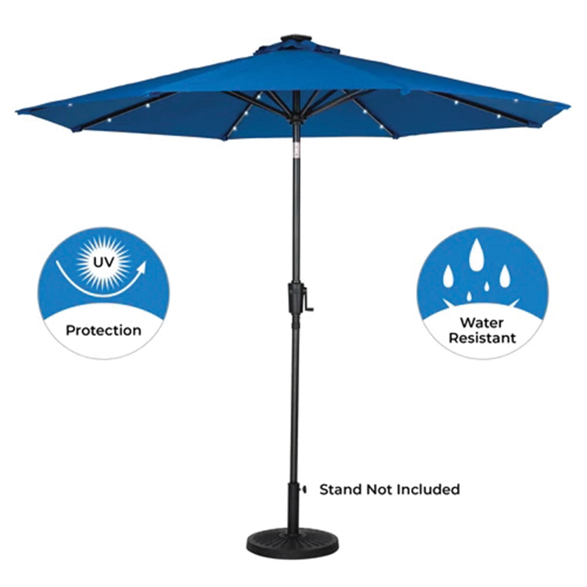 Get ready to entertain from dusk until dawn with the 9 ft tall solar lighted patio umbrella. This patio umbrella is a versatile item that moves seamlessly from day to evening use. This beautiful accessory will transform any outdoor area into your favorite place to relax with friends or enjoy a meal at your outdoor table even after the sun goes down. The canopy is 180G polyester, so it is durable and ready to stand up to the elements. This umbrella provides plenty of shade on hot summer days. Simply tilt the umbrella using the tilt function to the ideal angle. This umbrella has a square solar panel at the top, which powers the lights along the umbrella ribs for 9 to 12 hr without the need for electricity. The umbrella pole is standard-sized and fits most umbrella stands as well as most dining and bistro sets that are designed to accommodate umbrellas.