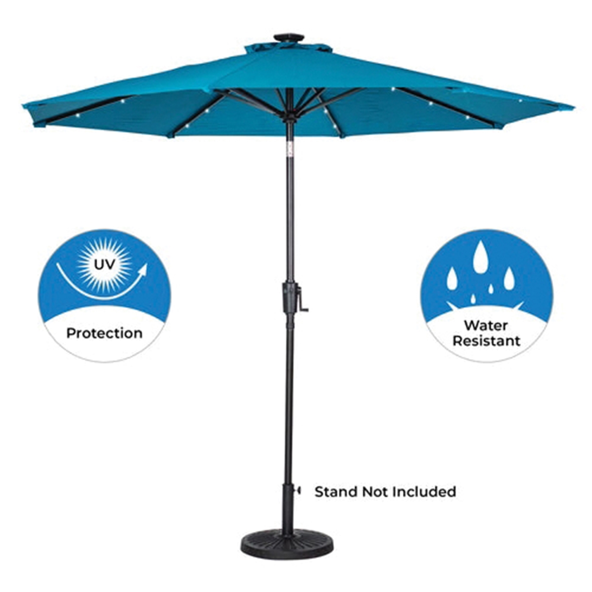 Get ready to entertain from dusk until dawn with the 9 ft tall solar lighted patio umbrella. This patio umbrella is a versatile item that moves seamlessly from day to evening use. This beautiful accessory will transform any outdoor area into your favorite place to relax with friends or enjoy a meal at your outdoor table even after the sun goes down. The canopy is 180G polyester, so it is durable and ready to stand up to the elements. This umbrella provides plenty of shade on hot summer days. Simply tilt the umbrella using the tilt function to the ideal angle. This umbrella has a square solar panel at the top, which powers the lights along the umbrella ribs for 9 to 12 hr without the need for electricity. The umbrella pole is standard-sized and fits most umbrella stands as well as most dining and bistro sets that are designed to accommodate umbrellas.