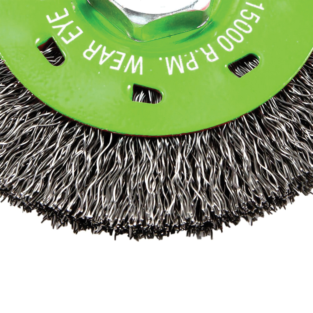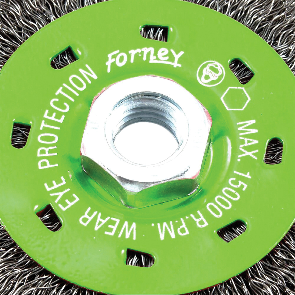 This Forney 4 in crimped wire wheel brush offers high impact cleaning power. It's the ideal wire wheel brush for cleaning and blending surfaces, removing light burrs, paint and corrosion. Excellent for light to medium-duty brushing action.