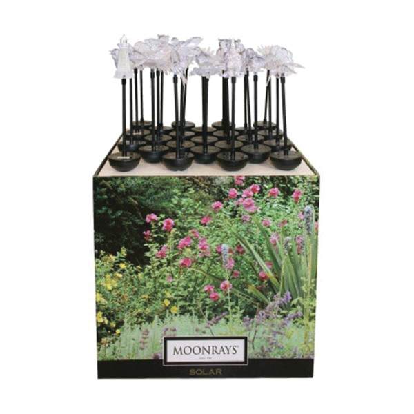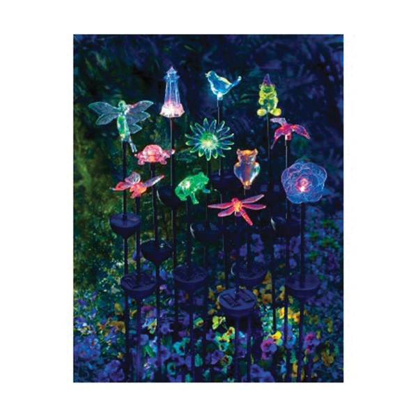 These acrylic solar stakes feature a clear acrylic, plastic and metal construction with seven color-changing solar LED lights that automatically illuminate and can run up to 8 hr on a full charge. AA NiCad batteries are included. The assortment contains one each of a butterfly, sunflower, dragonfly, begonia, turtle and frog plus four hummingbirds, four fairies, three gnomes, three lighthouses, three owls and two birds. Stake is 34 in H. Ornaments are 4.3 in.