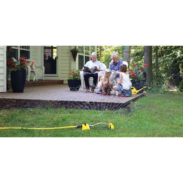 Ideal for watering small, medium and large areas. Each pattern can be selected by the simple twist of the selector dial. Offers an adjustable circle of coverage Up to 360 deg with maximum spray coverage of up to 40 ft in Dia. Mounted to a die cast metal sled base, which can easily be pulled through the lawn. The gear drive sprinkler is a great mobile, flexible sprinkler for a variety of watering applications. The pass-through feature allows additional sprinklers to be connected to cover larger areas. The color storm 4-pattern gear drive sprinkler is made of heavy-duty material.