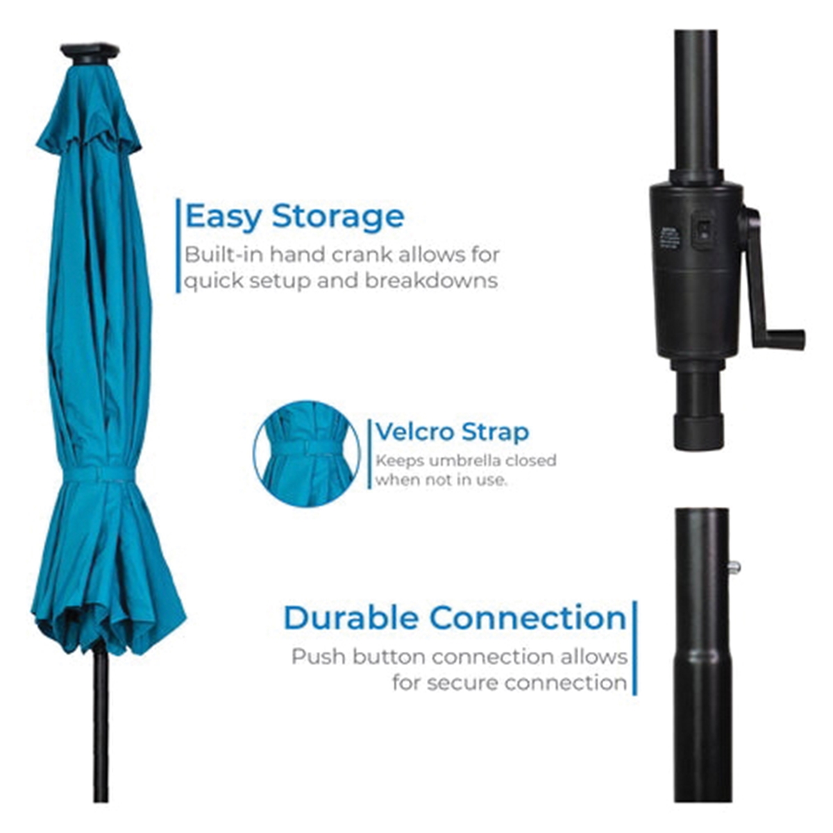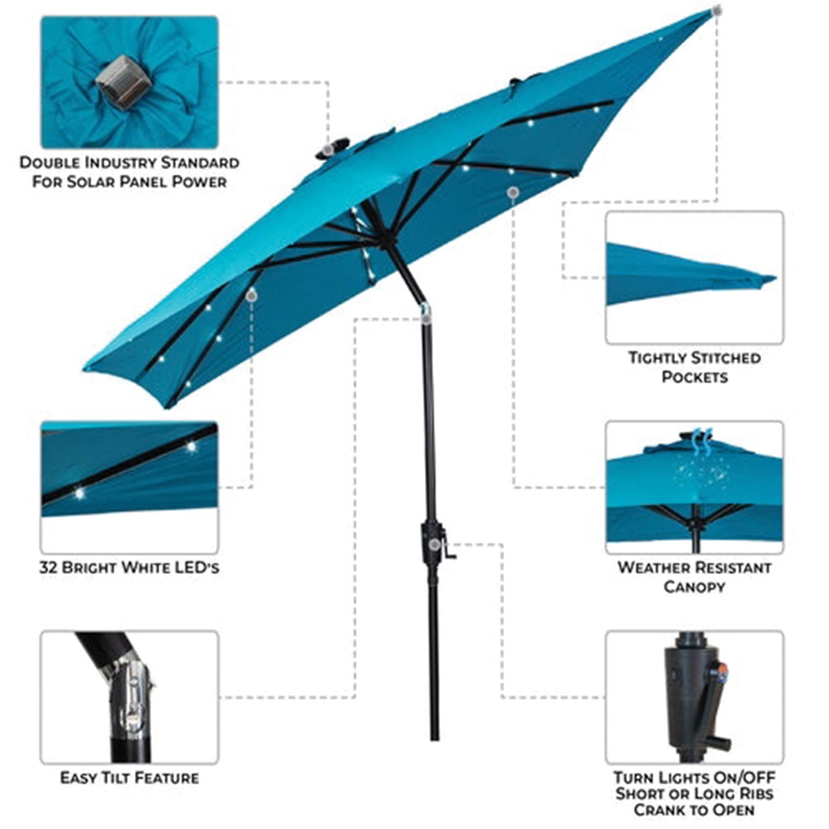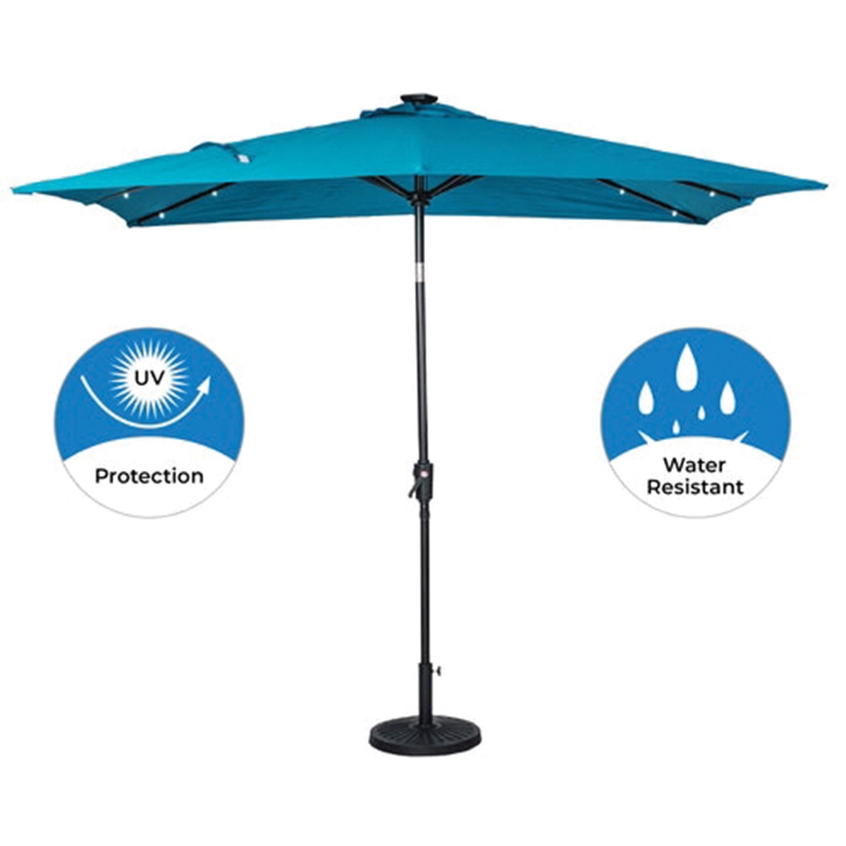 Get ready to entertain from dusk until dawn with the 9 x 7 ft rectangular solar lighted patio umbrella. This patio umbrella is a versatile item that moves seamlessly from day to evening use. This beautiful accessory will transform any outdoor area into your favorite place to relax with friends or enjoy a meal at your outdoor table even after the sun goes down. The canopy is 180G polyester, so it is durable and ready to stand up to the elements. This umbrella provides plenty of shade on hot summer days. Simply tilt the umbrella using the tilt function to the ideal angle. This umbrella has a square solar panel at the top, which powers the lights along the umbrella ribs for 9 to 12 hr without the need for electricity. The umbrella pole is standard-sized and fits most umbrella stands as well as most dining and bistro sets that are designed to accommodate umbrellas.