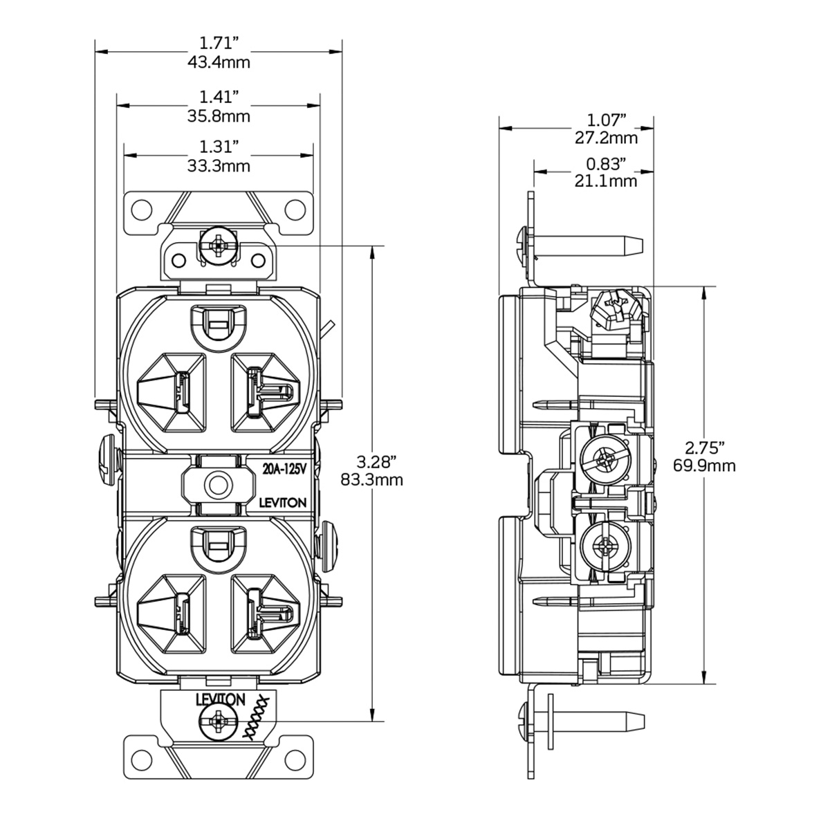 Leviton Duplex Receptacle, 125 V, 15 A, 2 Pole, 3 Wires, Back, Side Wiring, 14 to 10 AWG Wire, 5-15R, -40 to 75 deg C Operating, Screw Mounting, PBT Polyester Blend, Black/Ivory/White, Dimensions: 1.71 in L x 1.07 in W