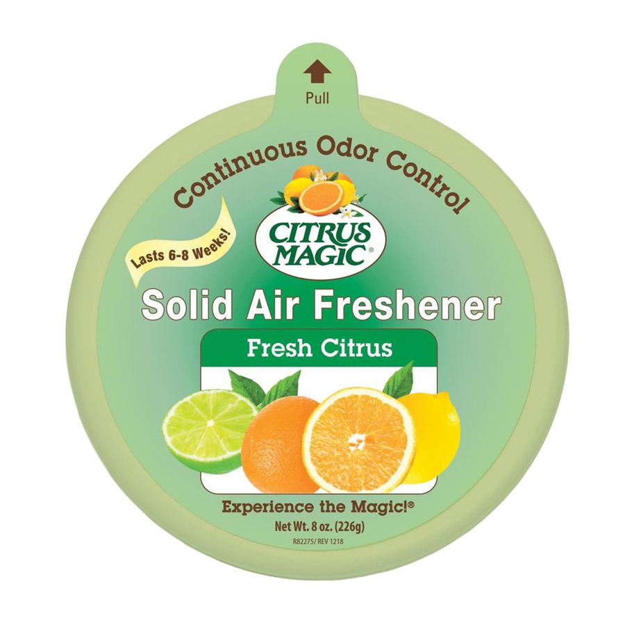 Citrus Magic™ Solid air fresheners provide convenient and continuous odor controls, that lasts! Using a unique formula, the solid air fresheners work to absorb odors while the fresh, clean scent fills the air. There is no mistaking the clean, fresh scent you find once you peel back the label of our popular 8 oz. Solid air fresheners. Controls odors and brightens up the air anywhere for up to 8 weeks.