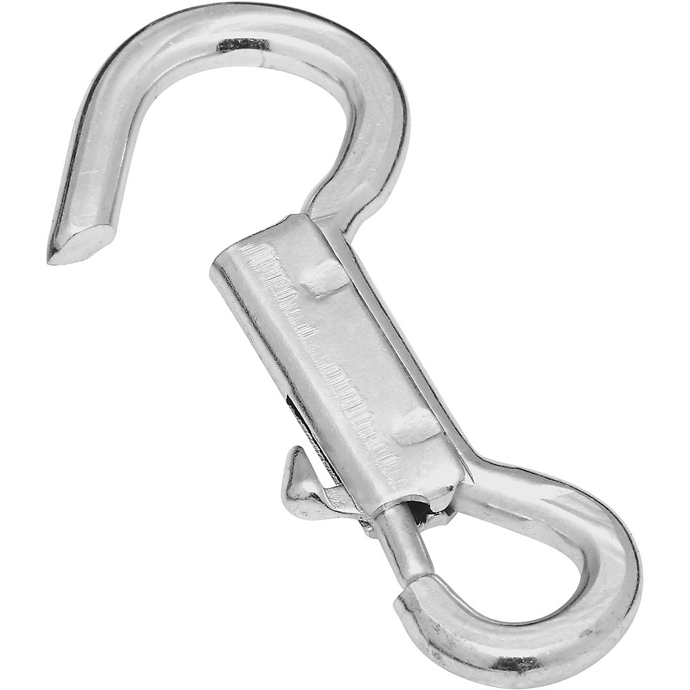 Designed to use with rope, chain, strap, animal leashes and other home, farm and recreational applications. Stainless steel spring. Open eye is designed to be closed with a vice or hammer after attachment. Easy bolt retraction with pull down trigger. Steel body. Zinc die-cast bolt.