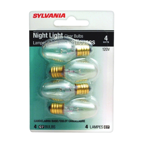 Sylvania 13549 Incandescent Lamp, Clear Lamp, 4 W, Candelabra E12 Lamp Base, C7 Lamp, 16 Lumens, 120 V