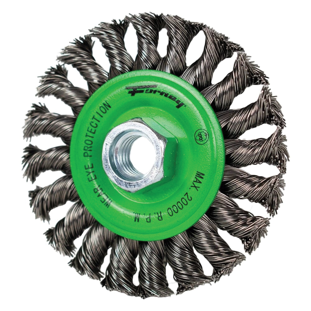 This Forney 4 in twist knot wire wheel brush provides high impact cleaning power, This wheel is designed for surface preparation prior to welding and for removing weld scale, spatter and heavy corrosion. Ideal for heavy-duty cleaning applications.