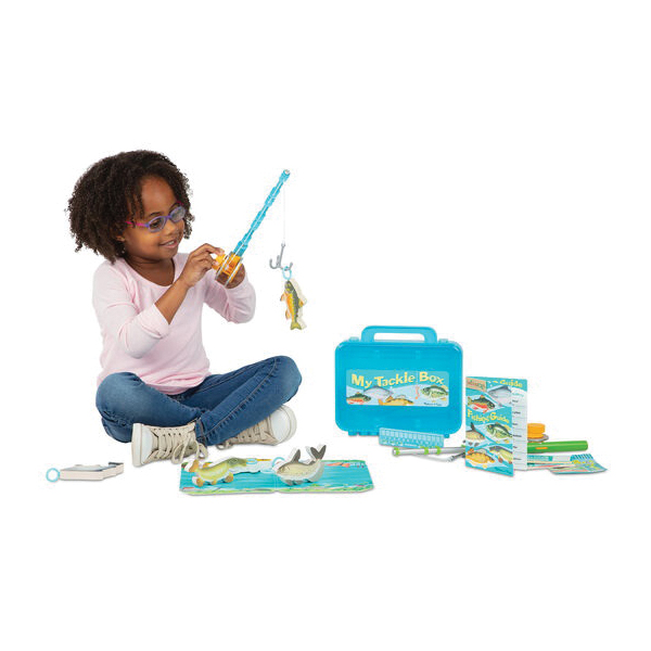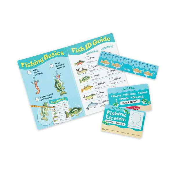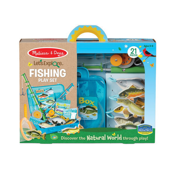 Explore the outdoor experience of fishing with the 21-piece Melissa & Doug Let's Explore™ fishing play set. Grab the two wooden fishing rods, bait the hooks with pretend worms, then hook and scoop up the six wooden fish. A reversible play mat lets young anglers choose a winter or summer experience. The illustrated fishing guide helps identify fish types, explains fishing basics and includes fun games. Everything stores in the tackle box for quick and easy clean-up. Let's Explore™ encourages kids three and older to connect with the natural world through imaginative play. Discover the joy of outdoor adventures that instill curiosity and confidence while inspiring kids to say, "Let's Explore™".