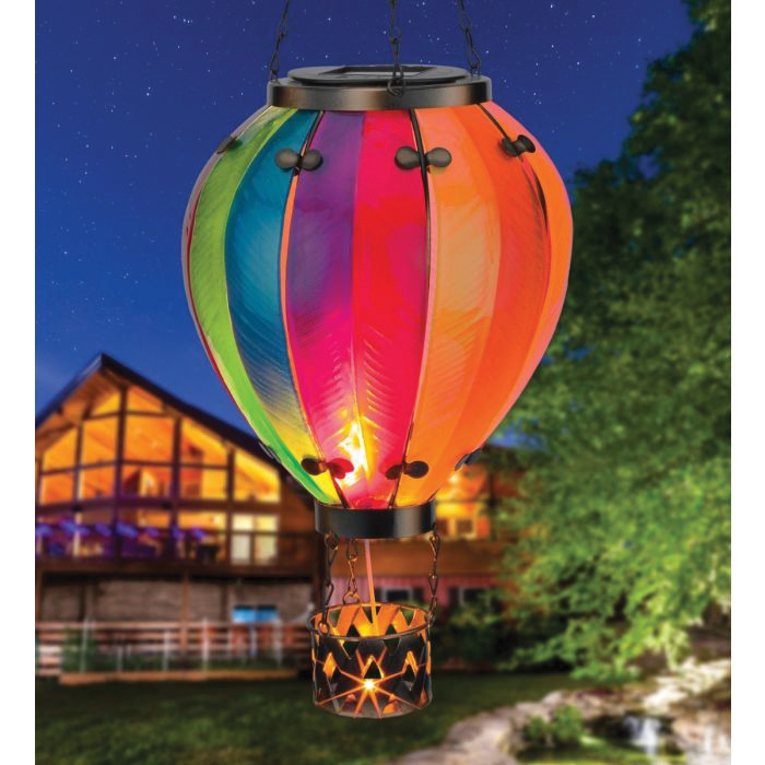 Beautifully hand painted multi-colored glass work in the most popular hot air balloon colors. Special flickering LED solar lights create the appearance of flames shooting up from the burner engine in a real hot air balloon. Truly an eye catching addition to any garden hanging on a tree, shepherds hook or a pergola. Uses solar panel 2 V 100 mAh, using Ni-MH AAA 600 mAh 1.2 V battery.