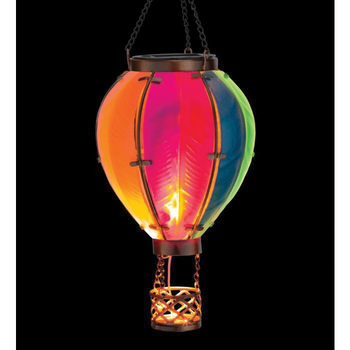 Beautifully hand painted multi-colored glass work in the most popular hot air balloon colors. Special flickering LED solar lights create the appearance of flames shooting up from the burner engine in a real hot air balloon. A very unique and dramatic effect. Uses solar panel 2 V 100 mAh, using Ni-MH AAA 600 mAh 1.2 V battery.