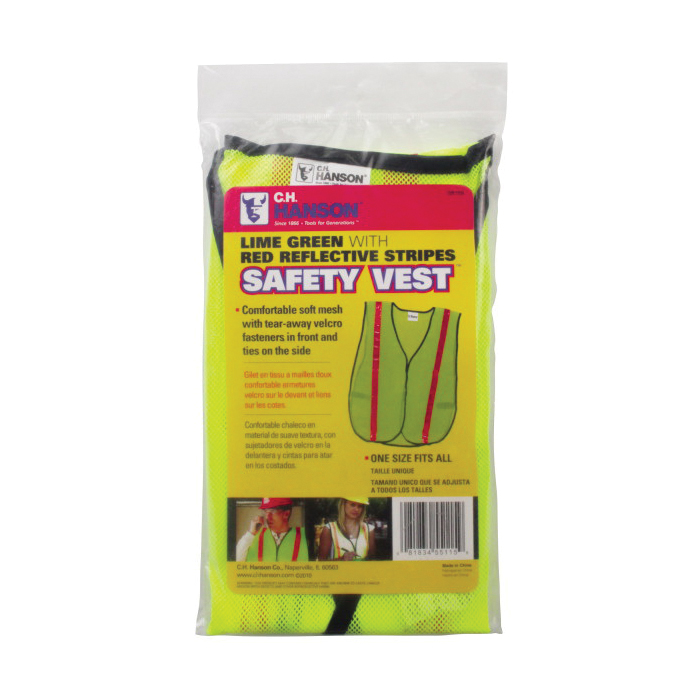 C.H. Hanson offers an excellent safety vest outfitted to keep you safe by making you more visible. The one size fits all vest features a hook and loop fastener in the front tie and on both sides. Each vest is lime green with red reflective stripes to provide high-visibility. Whether you are a crossing guard or construction worker, C.H. Hanson's safety vest is a great fit.