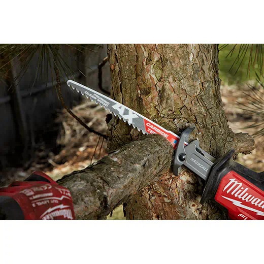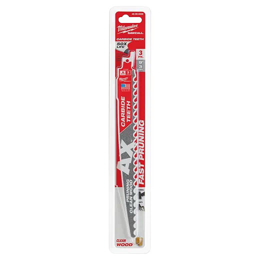 Our AX™ with carbide teeth SAWZALL® blades for pruning and clean wood are designed for the fastest above and below ground cutting applications. These SAWZALL® pruning blades offer up to 50x more life vs carbon steel reciprocating saw blades available today. The Milwaukee AX™ blades for pruning and clean wood cutting offer a 3 TPI design, which allows for the fastest cutting in clean wood and a low profile blade geometry designed for root removals. Our optimized carbide teeth withstand abrasives like rock, sand and dirt as users remove roots for trenches or stumps for tree removals. Milwaukee carbide teeth products allow you to cut longer, cut more and cut faster than other carbide teeth blades on the market.