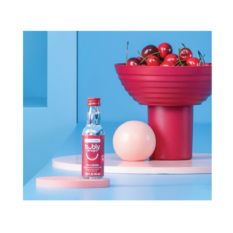 New cherry bubly drops™ - a fun way to sparkle your water with cherry flavor essence. Make your favorite bubly™ sparkling water right at home with SodaStream. No calories, no sweeteners, all smiles™. One 40 mL bubly drops™ bottle makes about 12 L of bubly sparkling water.