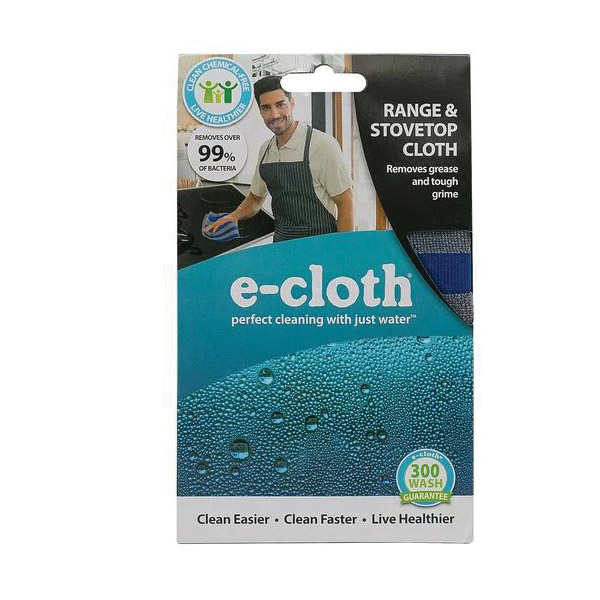 The e-cloth range and stovetop cloth cleans stovetops, oven surrounds and microwaves, removing grease, grime, stuck-on residues and over 99% of bacteria with just water.