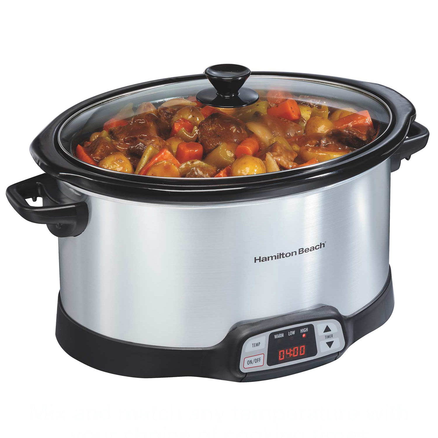 Know when dinner will be ready with flexible programming. Cook any slow cooker recipe effortlessly and in the time you need it, with the Hamilton Beach programmable countdown slow cooker. Easily schedule your meal to be ready when you want it with programmable times ranging from 30 min to 18 hr and low or high-heat settings. This slow cooker's extra-large, 8 qt capacity and oval shape make it ideal for cooking larger roasts or cuts of meat. It's size also makes it ideal for entertaining, special occasions or large family meals. Making a delicious, home-cooked meal is as easy as putting a few ingredients in the crock and turning it on. A countdown timer lets you keep track of when dinner will be ready and once cooking time is up, the slow cooker automatically switches to warm. When you're done, both the lid and crock remove easily and can go into the dishwasher for cleanup. A countdown timer displays remaining cooking time. Large, 8 qt capacity this slow cooker is sized just right for feeding a crowd, satisfying the appetite of a large family or batch cooking. The oval-shaped stoneware can fit a variety of foods, such as an 8 lb chicken or a 6 lb roast. Automatically switches to warm once your cooking time is up, the slow cooker automatically shifts to warm. The warm setting is ideal for buffets or when dinner ends up later than you planned. Dishwasher safe for quick and easy cleanup. The removable stoneware and glass lid are both dishwasher safe, making cleanup a breeze. Hamilton Beach products are thoughtfully designed to make your life easier. We use consumer insights, in-depth research and rigorous testing to deliver the excellent solution to your everyday needs. Whether it's preparing delicious meals and beverages effortlessly or making your clothes look their excellent, you can count on the brand that has spent over 100 years creating products with you in mind.