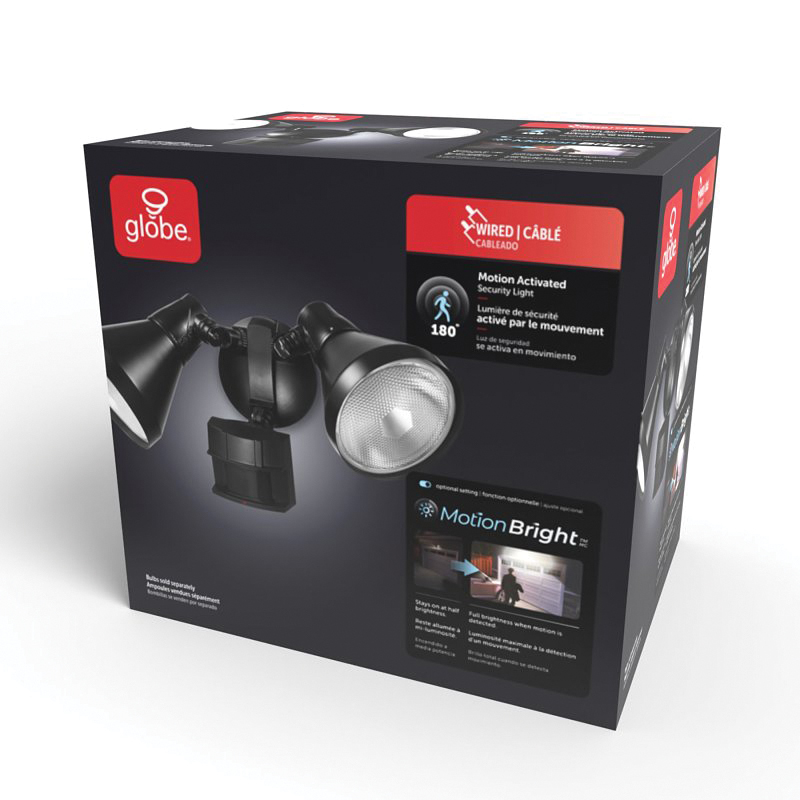 Upgrade your outdoor spaces with the motion sensor swivel arm motion bright security flood light. Experience motion detection capabilities from all angles with a remarkable range of up to 70 ft or 21 m and a 180 deg detection zone. Automatically turning off after 1, 5 or 20 min gives you the flexibility to choose the duration that suits your needs. The swivel arm design allows easy adjustment of lamp heads for customized light coverage while the motion bright feature keeps light at a low setting until motion is detected when it goes to full brightness. Use 2X dimmable standard base E26 PAR38 shape 120 W max bulbs. Install effortlessly with the dual-mount system which includes all mounting hardware to give you the option to wall-mount or eave-mount and enjoy its weather-resistant, durable construction. Ideal for pathways, sheds, garages and more. Backed by a 2 year warranty, you can trust in the GLOBE ELECTRIC commitment to quality.