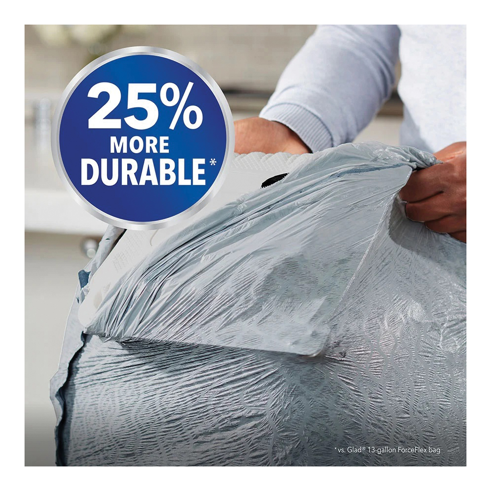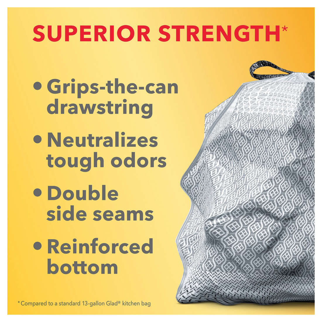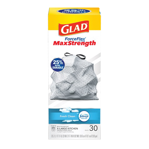 Glad ForceFlexPlus tall kitchen drawstring trash bags provide 2X leak protection with double side seams and a reinforced bottom to guard against leaks and trap liquids in the bag. Designed with ForceFlexPlus technology, these trash bags provide two layers of strength and stretch for 2X leak protection. Plus, they trap, lock and neutralize odors with lasting Febreze freshness in Fresh Clean scent. What goes in the trash, stays in the trash with Glad, featuring RipGuard and LeakGuard technology. Glads two durable layers handle the most demanding trash, with an outer layer to protect against leaks and a strong inner layer to prevent rips and tears. The Grips-The-Can drawstring ensures that the bag stays in place, making it easy to close and carry out the trash.