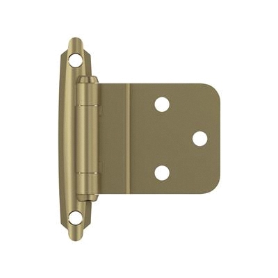 Amerock Cabinet Hinge, Hinge Opening: 105 deg, Cabinet Frame Type: Face, Inset Size: 3/8 in, Screw Mounting, Number of Holes: 5, Close Type: Self-Closing, Steel, Projection Size: 1-1/16 in, Golden Champagne, Dimensions: 2-3/4 in L x 2 in W, Includes: #6 x 5/8 in Oval Head Screw