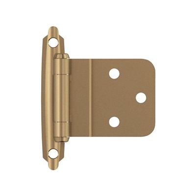 Amerock Cabinet Hinge, Hinge Opening: 105 deg, Cabinet Frame Type: Face, Inset Size: 3/8 in, Screw Mounting, Number of Holes: 5, Close Type: Self-Closing, Steel, Projection Size: 1-1/16 in, Champagne Bronze, Dimensions: 2-3/4 in L x 2 in W, Includes: #6 x 5/8 in Oval Head Screw