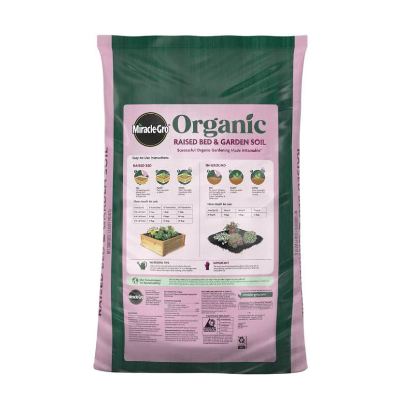 Successful Organic Gardening Made Attainable™. Miracle-Gro® organic raised bed and garden soil is a soil blend with quick-release natural fertilizer that grows more vegetables assured. Our organic soil blend is peat-free, formulated with upcycled green waste and feeds plants for up to two months. In addition, it is locally crafted. Miracle-Gro® organic raised bed and garden soil is ideal for raised bed and in ground gardening. When planting in a raised bed, fill with Miracle-Gro® organic raised bed and garden soil then plant new seeds or plants. When planting in ground, thoroughly mix in 3 in of Miracle-Gro® organic raised bed and garden soil for every 6 in of native soil then plant new seeds or plants. Always water thoroughly immediately after planting, whether in a raised bed or in ground. It is important to check soil for moisture levels. Let the mix dry to the touch between waterings. Do not allow plants to sit in drainage water. Outdoor plants may require daily watering in hot weather.