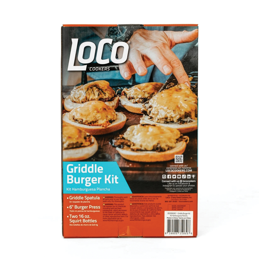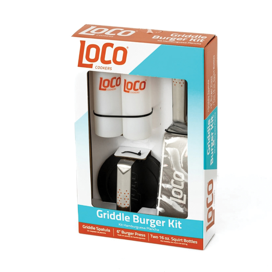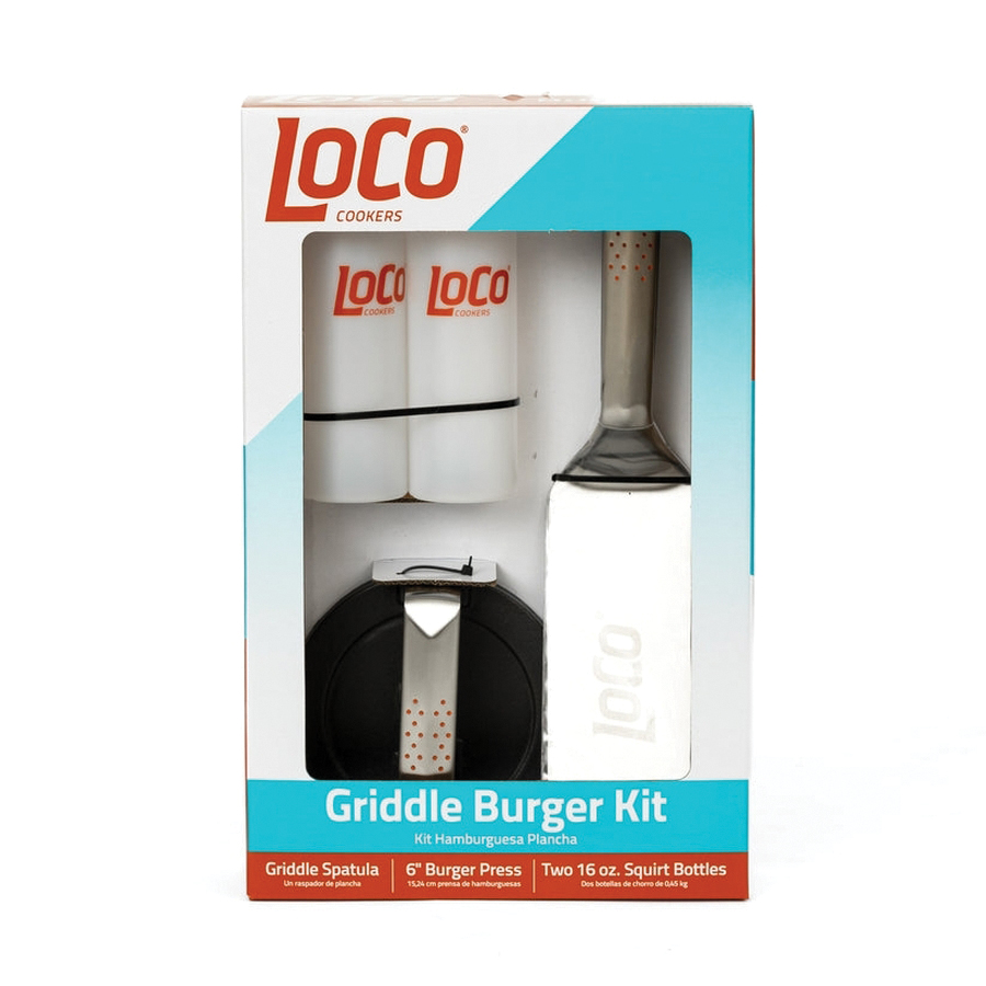 Achieve mouth watering, juicy burgers every time with the LoCo griddle burger kit. Featuring a 6 in cast iron burger press for smash burgers that retains heat, cooking burger evenly and a heavy-duty stainless steel spatula for seamless flipping. Kit also includes two squirt bottles for your favorite condiments which are made of durable BPA-free plastic and specially designed with drip-resistant tips, to assist with cooking and cleanup. Dishwasher safe.