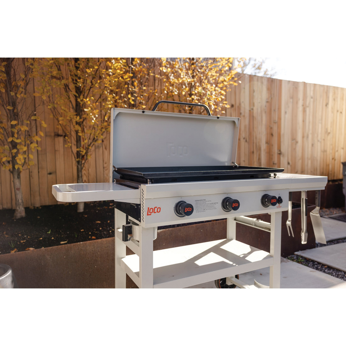 LoCo SmartTemp Classic Griddle, Gas Type: Propane, Primary Cooking Surface Area: 668 sq-in, Cooking Surface Width: 36 in, Number of Burners: 3, Storage Type: Rack, Ignition Type: Electrical, Control Type: Knob, Thermometer Included: Yes, Side Shelf Included: Yes, Chalk