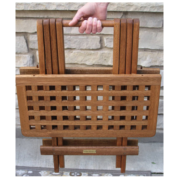 The Outdoor Interiors eucalyptus folding side table is a handy item for lounging, camping, boating or use with any of our matching loungers, benches and more. This lattice design folding side table is made from sustainable, plantation grown Brazilian eucalyptus hardwood for long lasting outdoor use and durability in all climates and is finished with a beautiful brown UV-resistant stain. This functional table comes fully assembled and folds down with a generous handle for easy portability.
