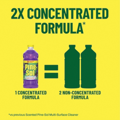 Now the Pine-Sol® cleaner you love is 2x concentrated to last twice as long. Tackle odor, grease, grime, dirt and allergens+ with a fresh scented favorite that packs double the cleaning power in every drop.