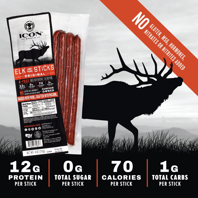 Our Icon Sticks are our top-selling product. Years of hard work by the Lautsbaugh family at Crescent Meats has went into coming up with just the right recipe for these with a stack of awards for the product to back them up. Made with 100% natural elk and high-quality pork. Our staple, traditional style. Loaded with high-quality protein and just savory enough to have some flavor, yet you can still really taste the flavor profile of the meat. Regenerative and natural, minimally processed with clean ingredients, no gluten, no MSG, no nitrates or nitrites, hormone and antibiotic free. Shelf stable.