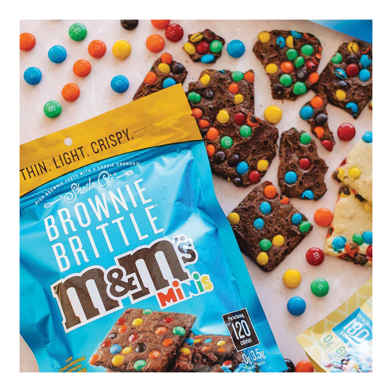 Brownie brittle is thrilled to announce the newest flavor in the family teaming up with the iconic confectionery brand, M&M'S® minis brownie brittle is a sweet snacking dream. Thin and crispy brownie brittle, with a rich chocolate taste, covered with real M&M'S® minis. At only 130 calories per serving, it hits that sweet craving without the guilt.