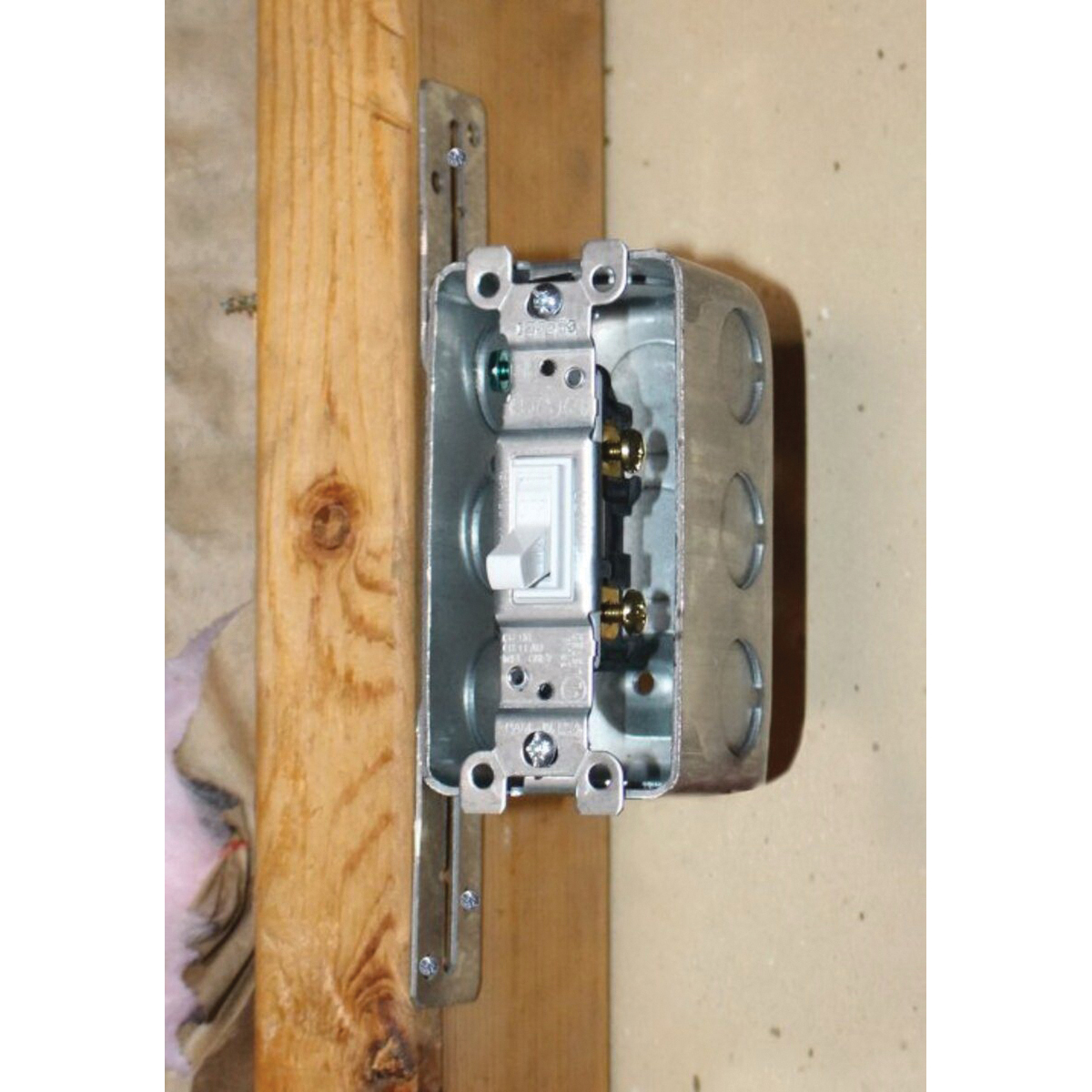 Southwire Handy Box, Cubic Capacity: 13.5 cu-in, Number of Gangs: 1, Number of Knockouts: 8, Knockout Size: 1/2 in, Rectangular, Cable Entry: Knockout, Galvanized, Silver, Steel, Dimensions: 4 in L x 2 in W x 2-1/8 in D, Includes: F Type Bracket