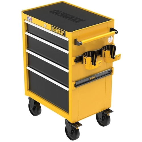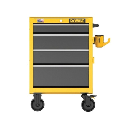 Get tough on organization with this 26 in 4-drawer rolling tool cabinet, a part of the DEWALT® metal storage solution. Featuring full extension soft-close, ball-bearing drawer slides, 6 x 2 in over-toe locking casters and a 18/20 ga steel construction, this mobile workstation helps maximize space and versatility for demanding jobs. Proudly made in the USA with global materials, this 4-drawer rolling tool cabinet is engineered with an internal keyed locking system that helps safeguard tools. With the included metal rails, power tool holsters and embossed top mat, this cabinet can be customized to suit the needs of your workspace.