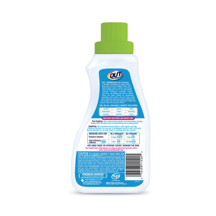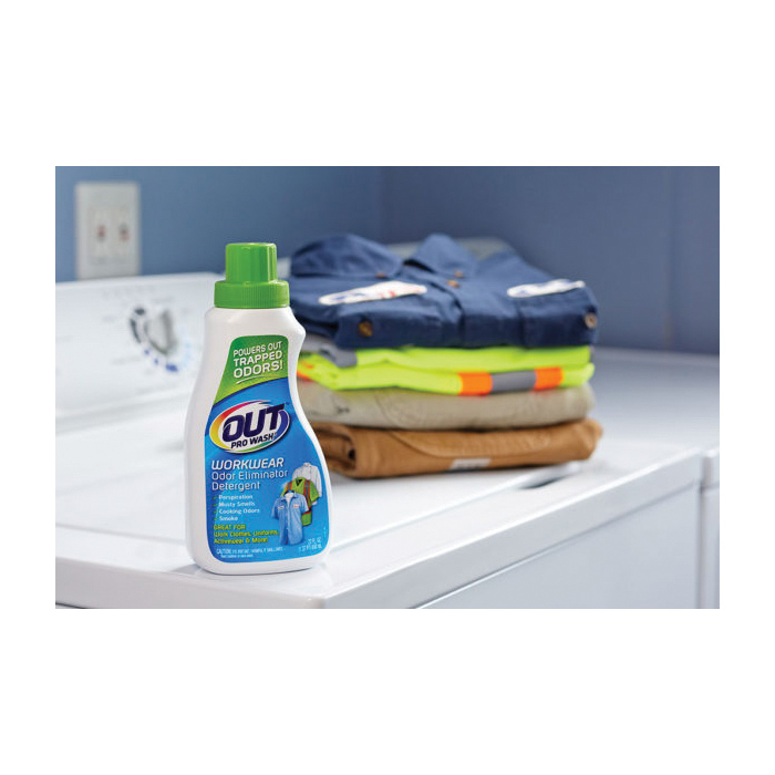 OUT ProWash workwear odor eliminator detergent is specially formulated to remove heavy duty odors and the toughest stains from hard-to-clean fabrics without sacrificing fabric performance. An unbeatable work clothes deodorizer and detergent, OUT's unique formula reaches deep to power out trapped odors by eliminating the odor, not masking with fragrance. ProWash is ideal for use on work clothes, uniforms, towels, bed linens, pet bedding and more to remove odors and stains caused by perspiration, mustiness, food, smoke, pets and other tough fabric problems. It may also be used as a sport laundry detergent on active wear or difficult to clean fabrics like microfiber. When your regular detergent just isn't enough, use OUT ProWash odor eliminator to keep your laundry clean and smelling fresh. Safe for use on all washable fabrics, including cotton, fleece, microfiber, wicking, nylon, lycra, spandex, polyester and washable wool.