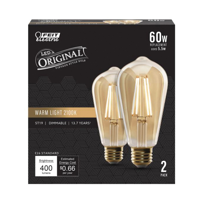 Enjoy all the benefits of advanced LED energy saving technology with a dimmable original vintage LED light bulb from Feit Electric. Replacing a 60 W incandescent light, this bulb produces 400 Lumens while using 5.5 W of electricity saving up to 91% in energy costs. A stylish streamlined design and amber glass with an exposed filament instantly liven up the decor of any room. These Feit Electric vintage LED bulbs have an average life of 15,000 hr/13.6 years are RoHS compliant and are 100% mercury-free. Choose a dependable decorative light to brighten your home.