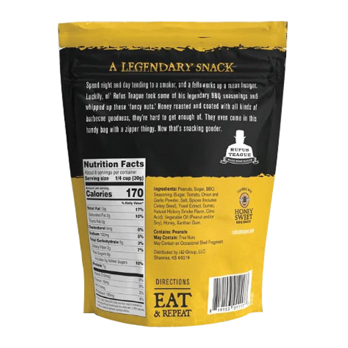 Okay, here's the deal these BBQ peanuts are so dang, good. Rufus took some of his legendary honey sweet BBQ flavors and whipped up these 'fancy nuts'. He really outdid himself this time. Way beyond tasty, these are truly unbelievable. All Rufus Teague genuine BBQ nuts are made with premium quality nut varieties and unlike anything you've had before. They are not only ideally honey roasted, but then coated in Rufus blend of BBQ goodness. Each comes in a stay fresh pouch that's resealable, as long as you can force yourself to stop eating long enough to zip it.