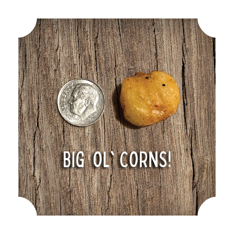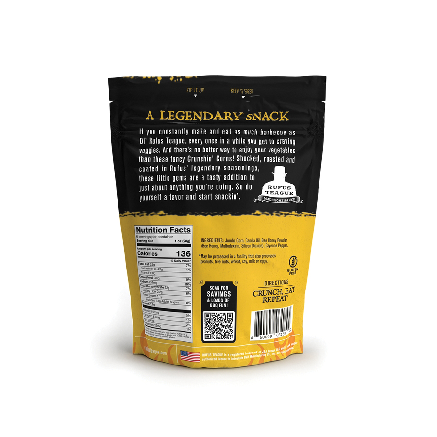 Our Crunchin' corns are extra-huge, roasted corn kernels with big time deliciousness. Seasoned up with flavors only Rufus knows how to concoct. The combination of real honey and cayenne pepper gives you the ideal ratio of heat to sweet and makes this snack bonafide winner. Comes with a recloseable zipper if you can actually stop eating them.