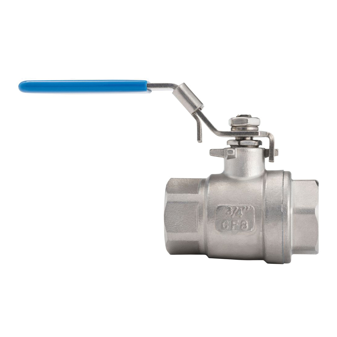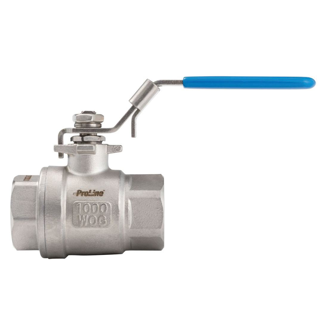 ProLine series 304 stainless steel ball valves are ideal for on/off flow control in high-corrosion environments. This valve's construction allows for a higher pressure and temperature rating compared to brass and has the added benefit of being lead-free, which is safe for potable water applications or other applications requiring a clean and reliable material. To facilitate easy on/off operations, this valve features a handle that is easy-to grasp and requires only a quarter-turn to open and close the valve. Another feature of this valve is the packing gland, which allows for quick fixes to stop any stem leaks with the use of a simple wrench. Designed with a blowout-proof stem, this valve is built to handle any unforeseen pressure surges. An added safety feature is the locking handle, which only allows for a secure operation by authorized personnel.