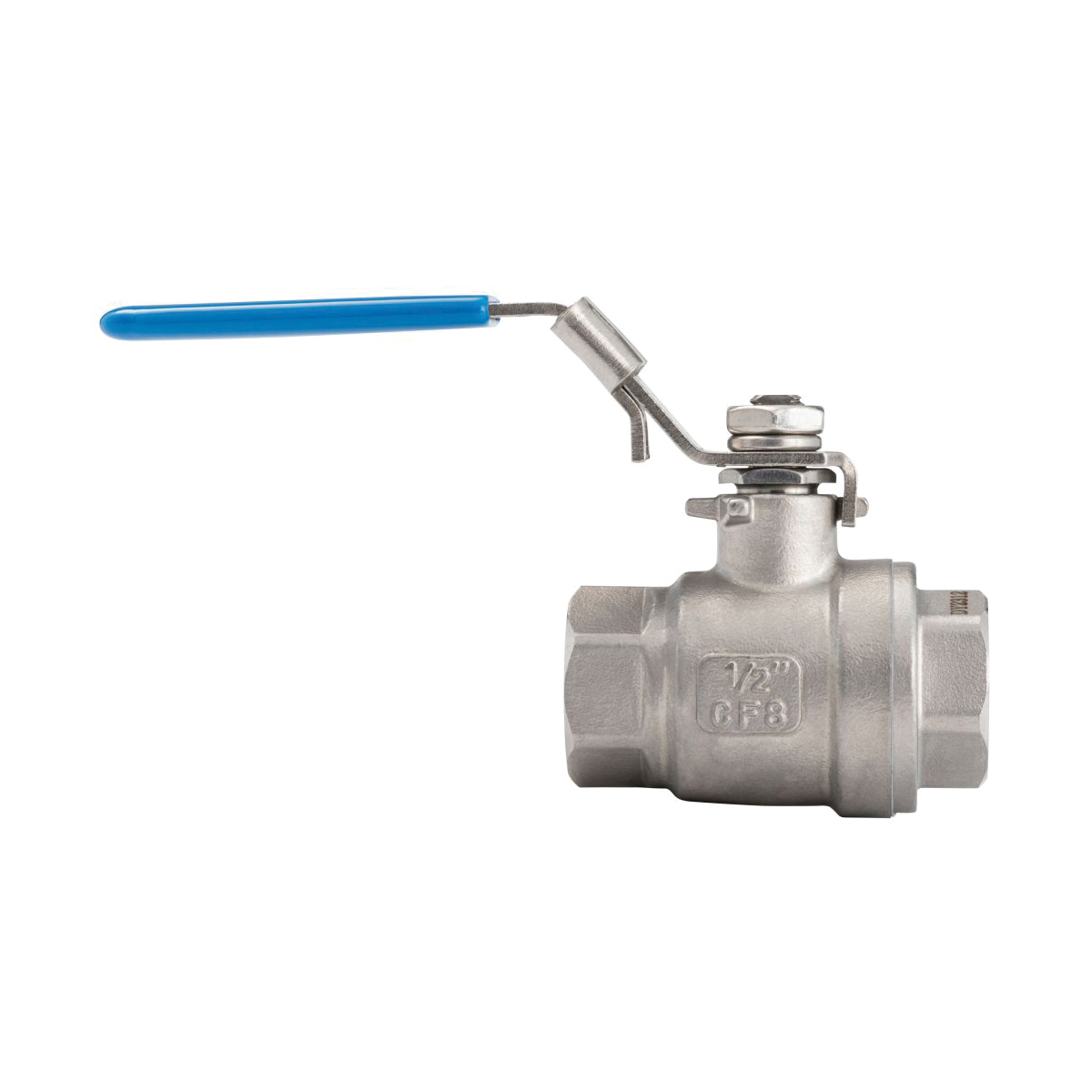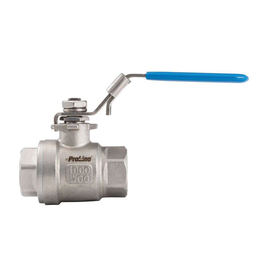 ProLine series 304 stainless steel ball valves are ideal for on/off flow control in high-corrosion environments. This valve's construction allows for a higher pressure and temperature rating compared to brass and has the added benefit of being lead-free, which is safe for potable water applications or other applications requiring a clean and reliable material. To facilitate easy on/off operations, this valve features a handle that is easy-to grasp and requires only a quarter-turn to open and close the valve. Another feature of this valve is the packing gland, which allows for quick fixes to stop any stem leaks with the use of a simple wrench. Designed with a blowout-proof stem, this valve is built to handle any unforeseen pressure surges. An added safety feature is the locking handle, which only allows for a secure operation by authorized personnel.