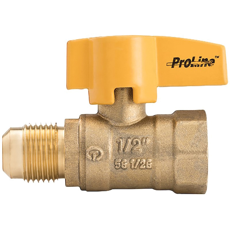ProLine Series 2-Piece Gas Valve, 1/2 in Connection, Flare x FIP Connection, 175 psi, Actuator Type: Lever, Temperature Rating: -20 to 300 deg F, Body Material: Brass, Chrome, Dimensions: 2.93 in L x 1.04 in W x 3.04 in H