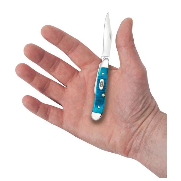 Dazzling, Sawcut jigged bone in stunning Caribbean Blue draws the eye to a convergence of color, craftsmanship and convenience. This azure stunner complements a design that features the Case Oval Script shield, accenting the mirror-polished Tru-Sharp surgical steel blades. Wow your friends and family with this glittering jewel. Peanut knives get their name due to their small petite size, fitting discretely and conveniently in a pocket or purse. This durable folding knife features two full length blades, the Clip blade and the Pen blade. The Clip blade is commonly used as a multi-purpose blade and preferred for detail work while the Pen blade is great for light work. This knife is constructed with Case Tru-Sharp stainless steel which is a special HCS that helps the blades hold an edge longer than conventional steel. It also offers extraordinary blade strength and corrosion resistance. Comes conveniently packaged in a box. Made in Bradford, PA, USA from domestic and imported materials.