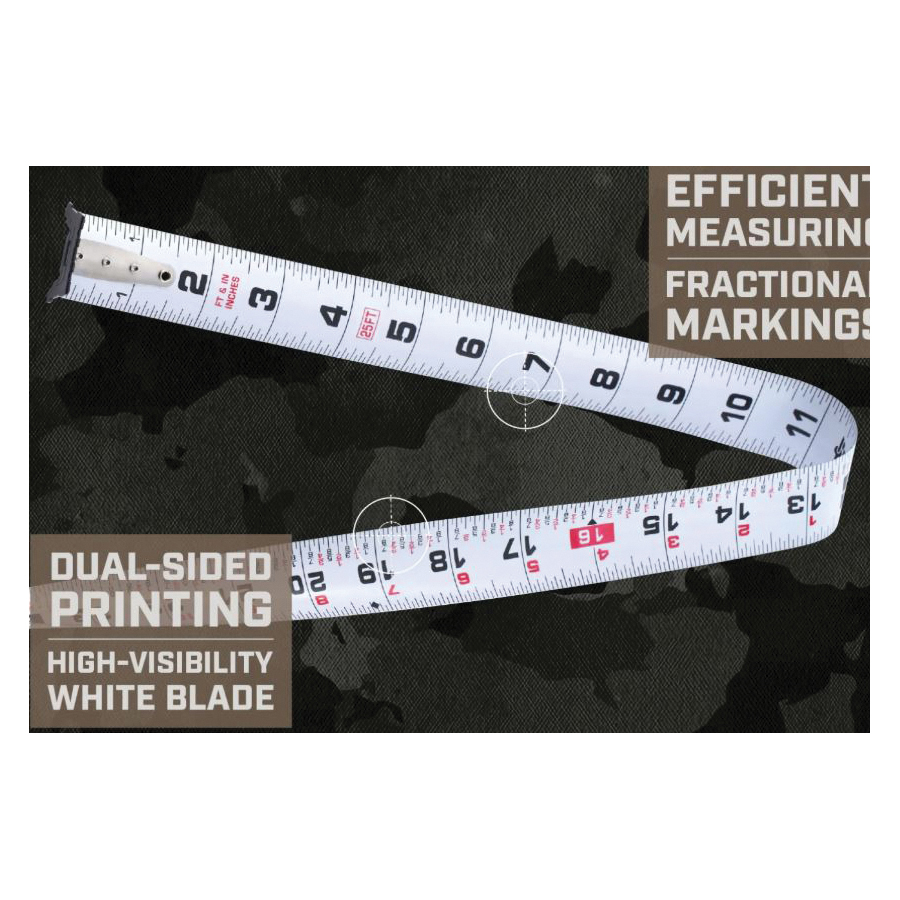 Spec Ops Elite Series SPEC-PTM25-F Fractional Tape Measure, 25 ft L Blade, 1-1/4 in W Blade, Steel Blade, ABS Case