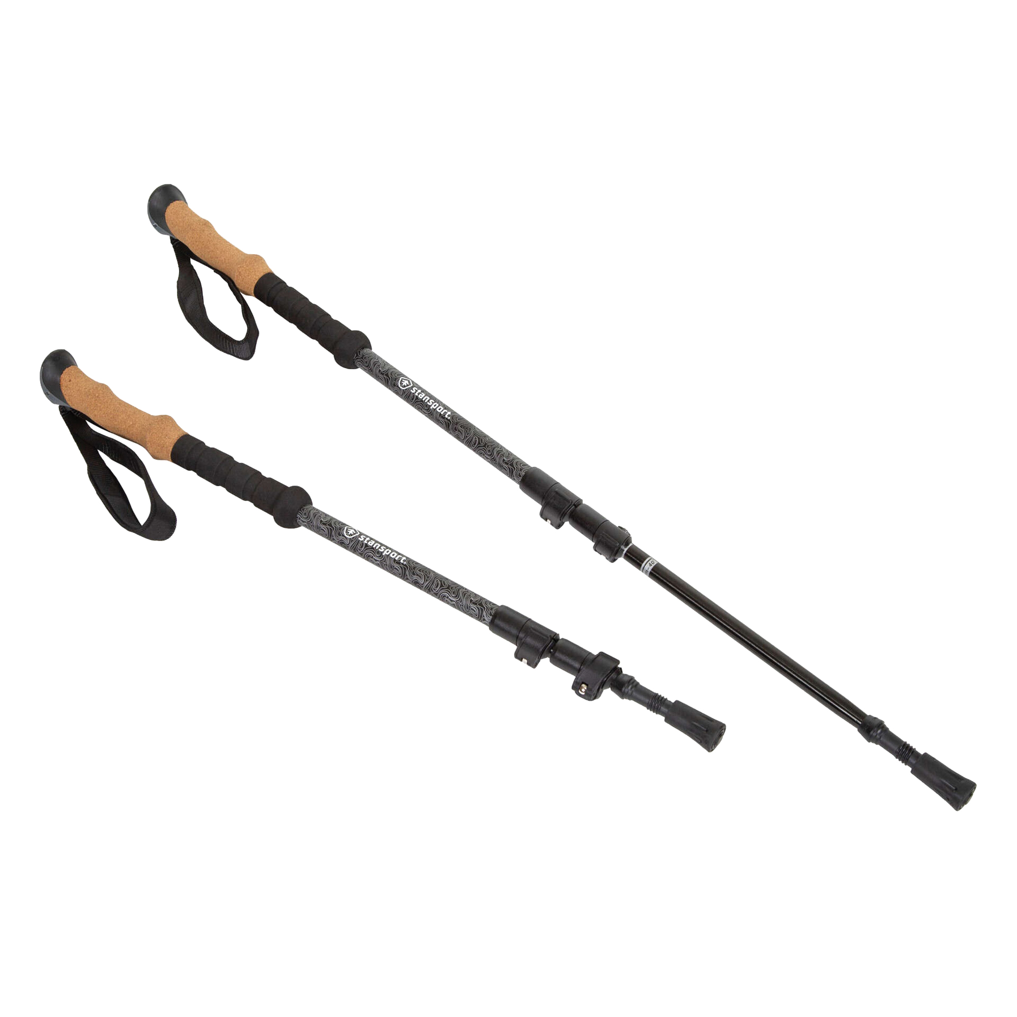 Our trekking poles provide excellent support for hiking, walking, backpacking and more. These aluminum poles extend from 25 to 53 in length. They feature a fast locking system for quick reliable relief, a lightweight breathable cork grip and adjustable wrist straps for extra comfort. Included a carbide tungsten tip with interchangeable rubber feet and snow baskets. Sold is a set of two with a carry bag included.