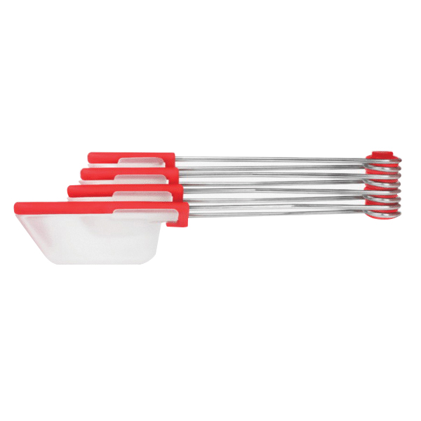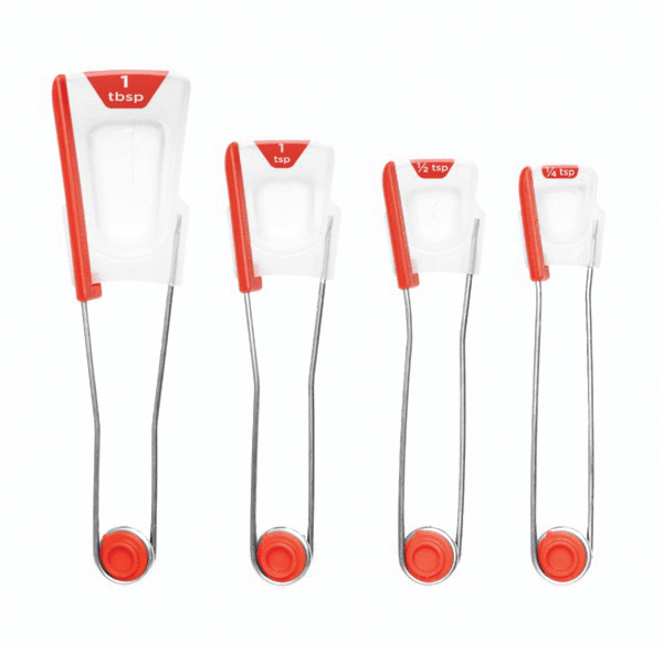 Levoons are our ingenious levelling measuring spoons. They look like regular measuring spoons until you squeeze their handles to make a scraper swipe across and push off all the excess ingredients, giving you a greatly level and accurate measurement. They are a set of 4 measuring spoons that snap together for storage, fan out for easy selection and can be easily snapped apart so you only have to wash the dirty ones.