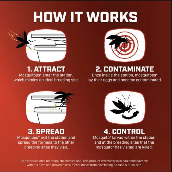 Don't settle for short-term mosquito relief. Kill and prevent mosquitoes with the Ortho® Home Defense® mosquito kill and prevent station. Backed by scientific research, this system uses mosquitoes own breeding behavior against them to control mosquito populations over time. This contained and targeted approach doesn't use broadcast sprays, repellents, flames or batteries and is easy to set-up and maintain for continued mosquito control. It's technology that's available to pest control pros, now available at a DIY price. How it works - Attract - the station mimics the ideal breeding site to lure in adult mosquitoes. Contaminate - once inside, mosquitoes lay their eggs while also becoming contaminated with a dual-action formula. Spread - adult mosquitoes exit the station and continue breeding, spreading the formula to the other sites they visit. Control - adult mosquitoes die within 9 days. Mosquito larvae inside the station and at the other sites adults have visited are killed by the formula. This system effectively kills and prevents new mosquitoes from developing.