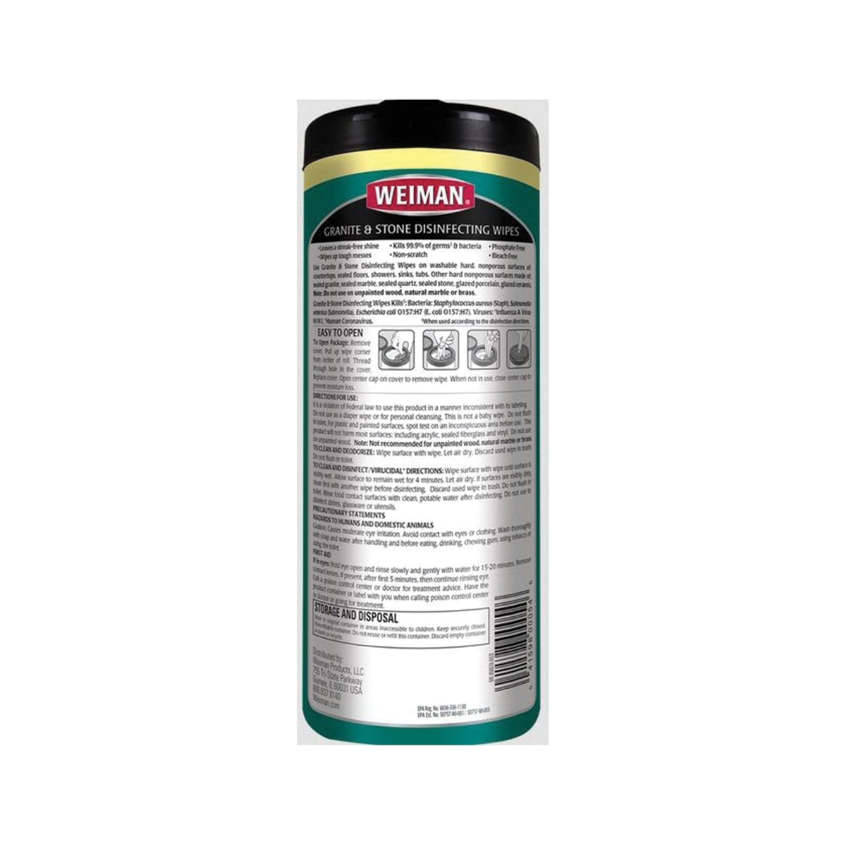 Weiman granite and stone wipes now have the power to disinfect your sealed stone surfaces. Our new disinfecting formula kills 99.9% of germs and bacteria in 4 minutes on hard, non-porous surfaces. Weiman granite and stone disinfecting wipes wipe up tough messes while leaving a streak-free shine. Clean, shine and disinfect countertops, floors, showers, sinks and more in kitchens, bathrooms and other household areas. This stone safe disinfectant formula can be used to kill germs, bacteria and viruses.