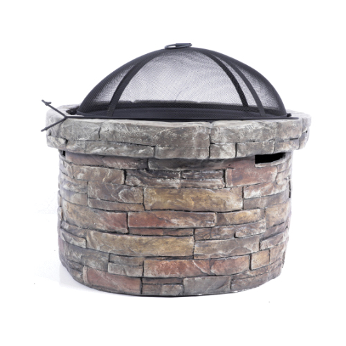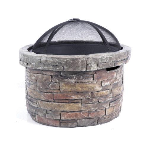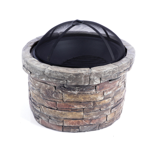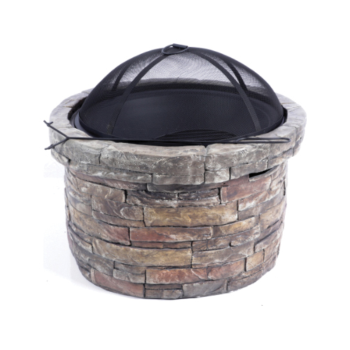 Durable stone fire pit. Burns firewood and fire logs (burning materials not included). Easy to assemble. Includes metal screen, wood grate and fire poker.