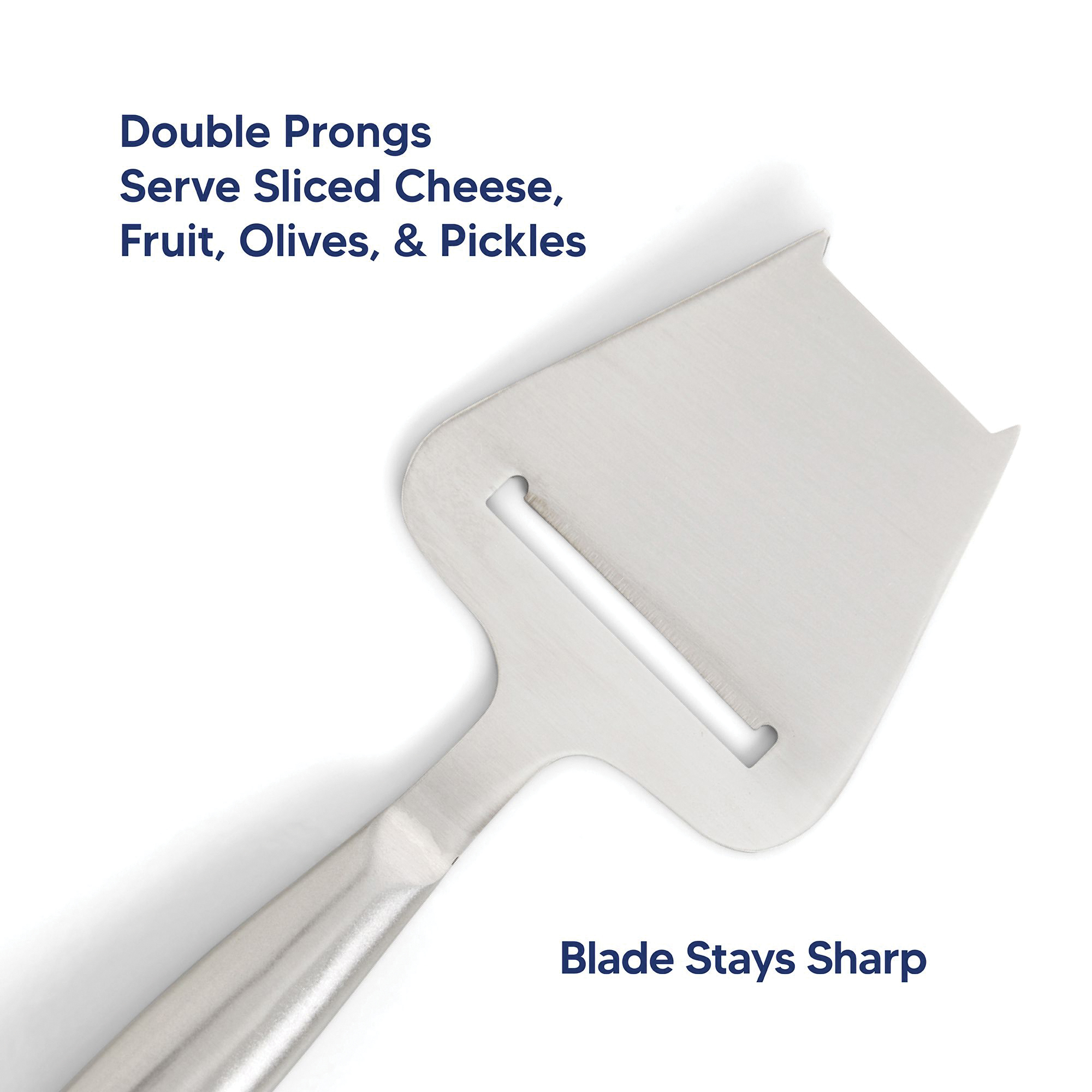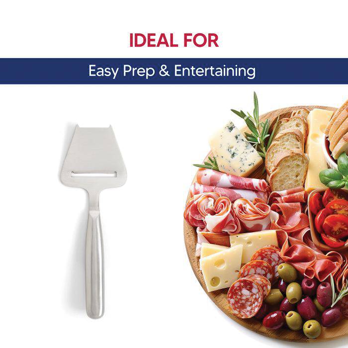 Maison du fromage's cheese plane easily cuts thin, even slices of hard-to semi-hard cheeses. It's ideally sized and well balanced, with a blade that stays sharp for a long time. The dual-forked tips serve sliced cheese effortlessly and the hollow handle offers a lightweight and comfortable grip during use. It's versatile, stylish and a great addition to everyday flatware and party accessories for entertaining. Easily top burgers, make grilled cheese and other sandwiches, prepare and serve beautiful cheese platters and charcuterie boards. Made with brushed stainless steel, Maison du fromage's cheese plane is sturdy, durable and compact for easy storage and won't stain or rust. Dishwasher-safe for easy cleanup. Maison du fromage offers the most essential tools and utensils to transform any cheese or charcuterie presentation into a work of art. Crafted from the highest-quality materials with a beautiful aesthetic, it's easy to prepare and serve cheese and charcuterie in style. Whether it's for everyday dining, entertaining or gi. Ting, find al. L the essentials for the ideal entertaining experience at Maison du fromage. Brought to you by hic, a third-generation family-owned and operated company in the USA since 1957.