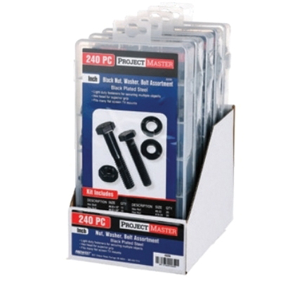 Midwest Fastener ProjectMaster Nut Washer and Bolt Assortment, Steel, Black, Number of Pieces: 240, Includes: (10) #8-32 x 1/2, (10) #8-32 x 3/4, (10) #10-24 x 5/8, (10) #10-24 x 1, (10) 1/4-20 x 3/4, (10) 1/4-20 x 1-1/4, (5) 5/16-18 x 1, (5) 5/16-18 x 1-1/2, (5) 3/8-16 x 5/8, (5) 3/8-16 x 1-1/2, (20) #8-32, (20) #10-24, (20) 1/4-20, (10) 5/16-18, (10) 3/8-16 Hex Nuts, (20) #8, (20) #10, (20) 1/4, (10) 5/16 and (10) 3/8 Split Lock Washers