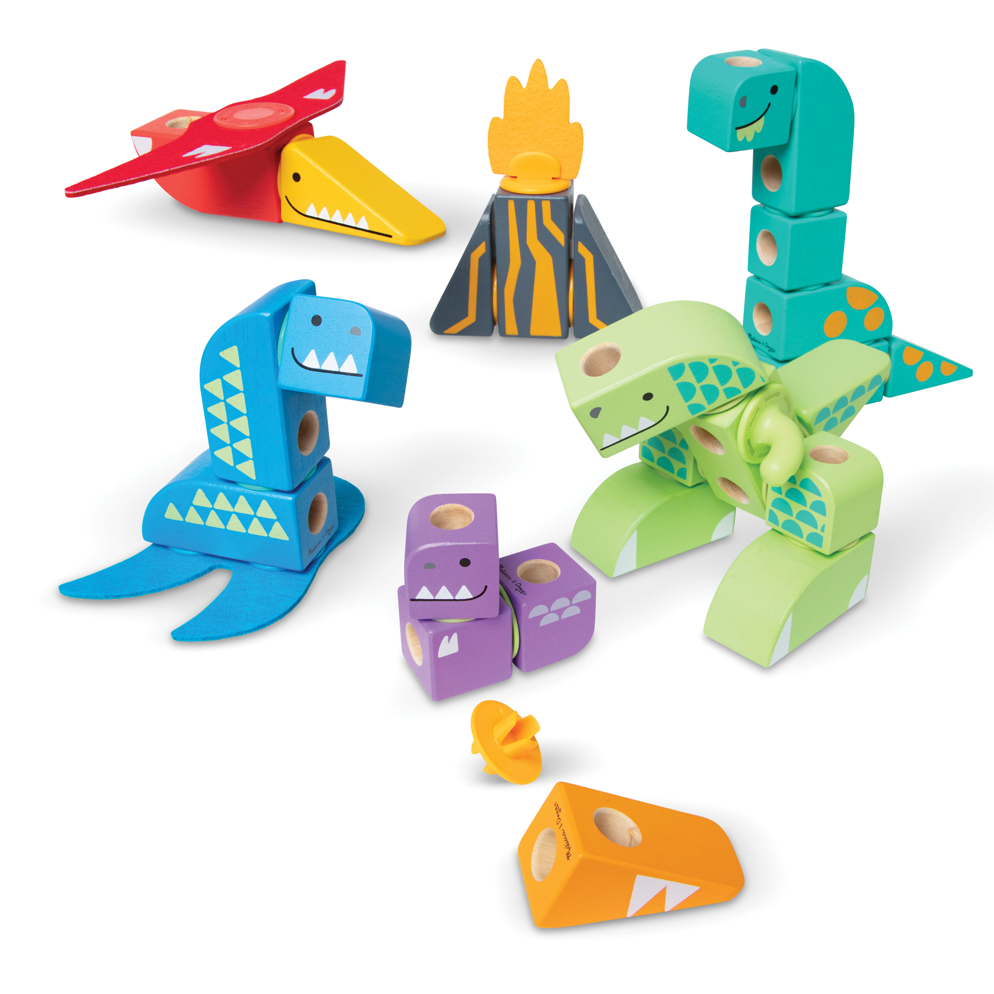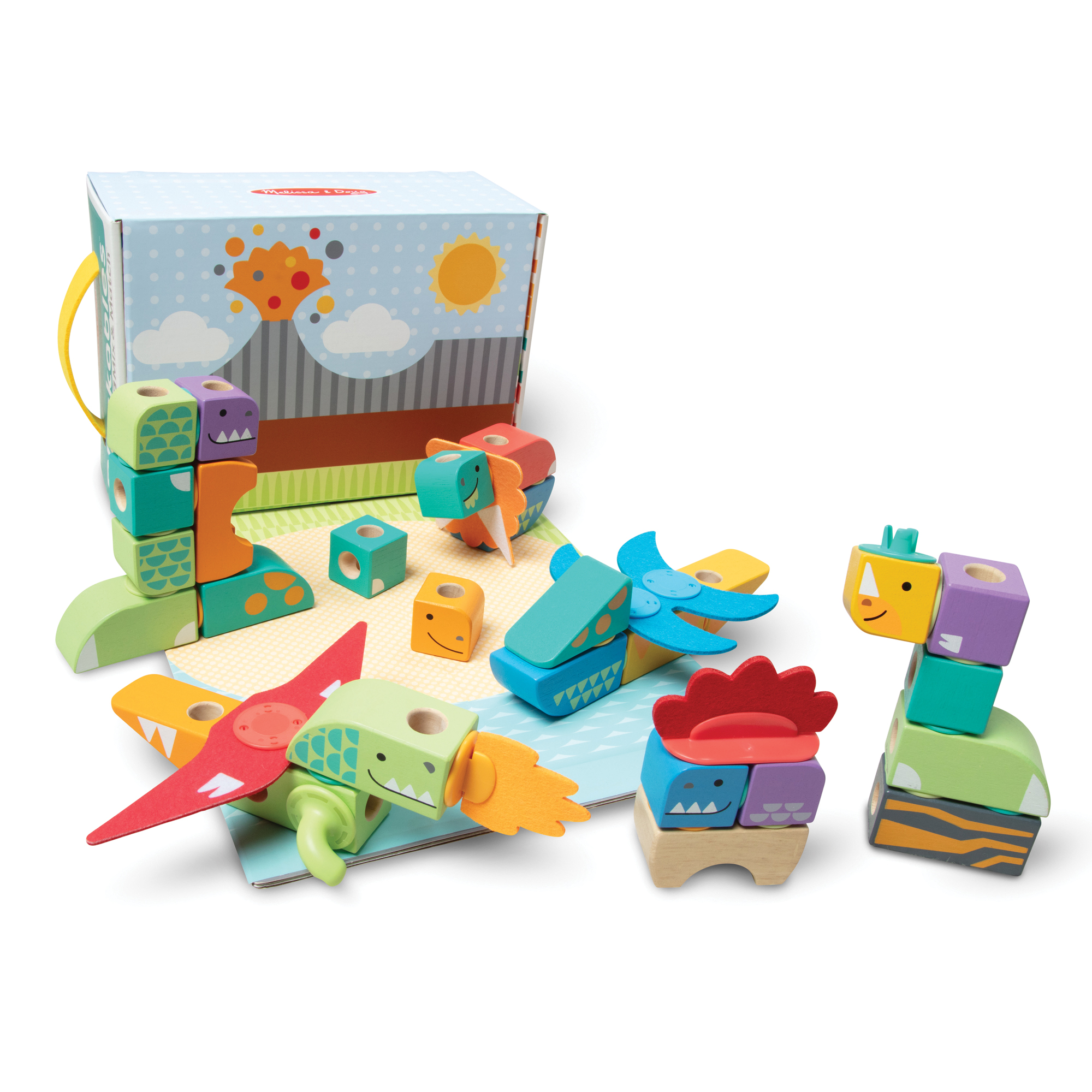Melissa & Doug Blockables™ are connectable, stackable and playable! The solid wood connect-and-play building blocks are ideal manipulatives to help preschoolers two and older boost developmental skills (fine motor, problem-solving, matching, storytelling and self-esteem), while using their imaginations and having fun. Easy-to-grasp smooth, colorful wooden blocks fit together in a snap with large connectors that even little hands can push in and pull out. An illustrated guide shows how to arrange and link the Blockables™ to create multi-textured dinosaurs (T-rex, Apatosaurus, pterodactyl, plesiosaurus, triceratops, stegosaurus) or kids can use their imaginations to mix, match and combine pieces to make unique figures and play their own way! Kids can easily expand their collection -- the 69-piece Dinosaur Play Set is compatible with all other Blockables™ play sets. The packaging folds out to convert into a fun play space and pieces store in the sturdy corrugated box with a soft handle for easy cleanup and portability. Patent pending.