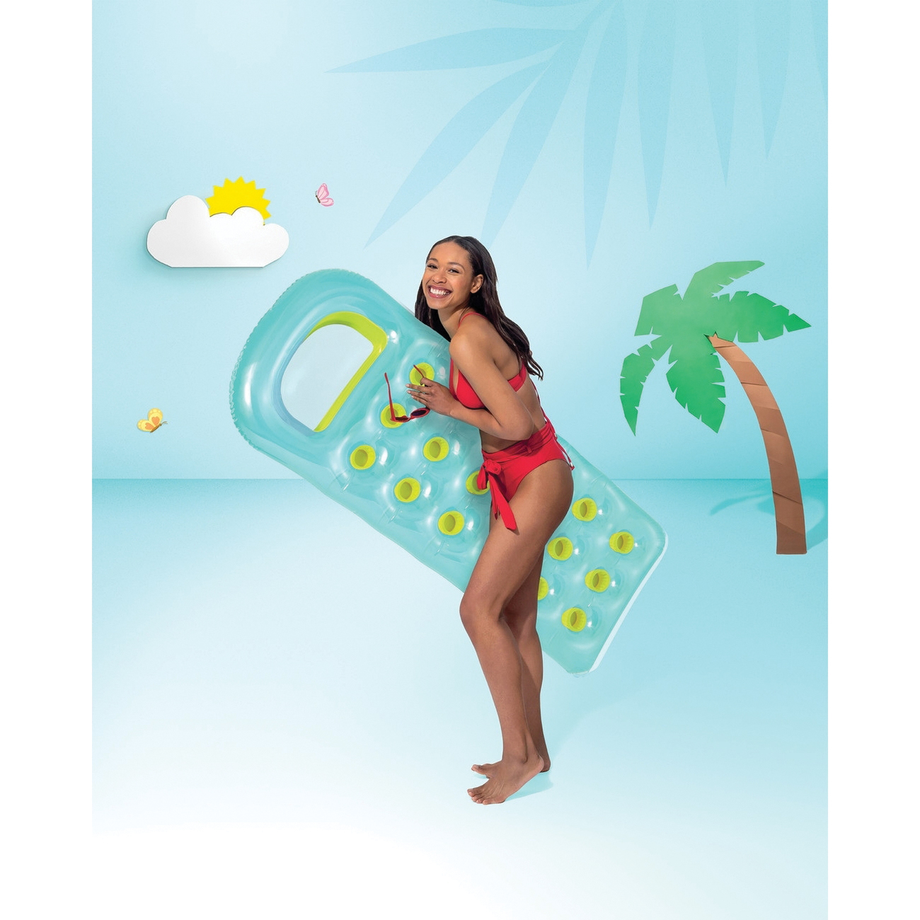 Relax and enjoy the pool with the Intex 18-pocket sun tanner mat. Designed with a clear vinyl top, color pockets and coil-beam construction, this lounge has a built-in see-through window that doubles as a contoured pillow for extra comfort while you float.